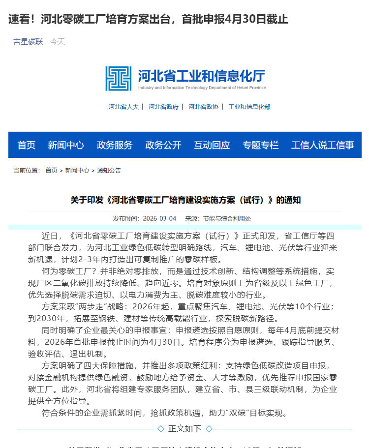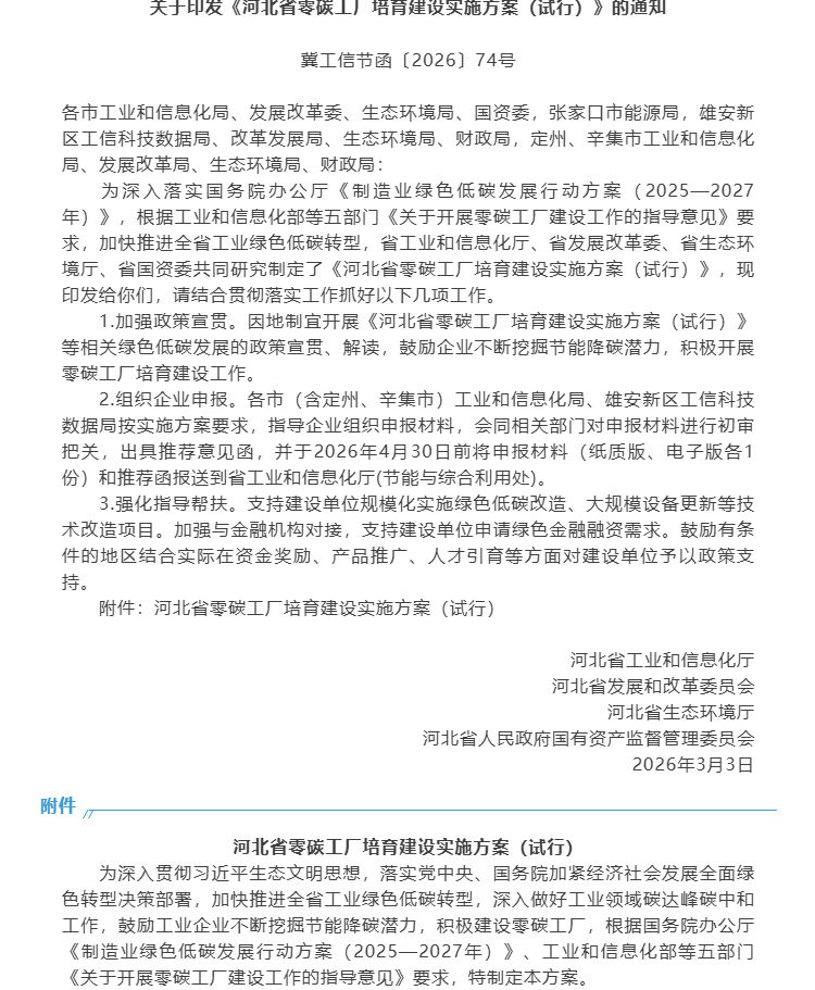 速看!河北零碳工厂培育方案出台,首批申报4月30日截止
